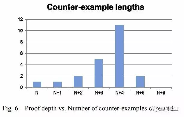 通常,单个端到端检查器会发现许多错误。对于每个反例(即真实bug,或者由于形式测试平台问题导致报出的错误),我们跟踪每个深度报告的反例的数量(图6是一个典型的图例)。对于图中的数据,如果形式验证技术在N个周期的深度报告第一反例,并且随后证明在更高深度(例如图6中的N + 6)没有故障,通常这个更高深度是形式验证所需的验证深度。