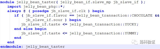 下面的代码描述的是一个简单的DUT也就是我们的彩虹糖评测员,会反馈彩虹可口程度的jelly_bean_taster.第一行使用了我们上面定义的接口jelly_bean_if来作为module的端口信号,slave_mp这个modport来定义信号的输入输出方向。从代码中可以看出,彩虹糖评测员只会给酸巧克力口味的彩虹糖差评,其他口味的都是好评。也就是当从interface输入给DUT的flavor信号是巧克力口味,并且sour信号是1的情况下,jelly_bean_taster的输出taste会输出YUCKY值,其他情况都是YUMMY值。