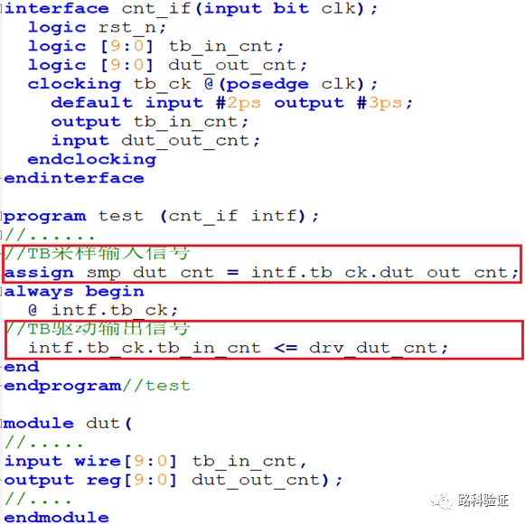 TB通过时钟块去采样DUT的output的值来作为TB的input,如sig1到sig3所示: