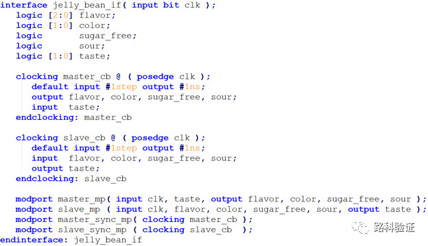- 使用modport来规定interface中定义的信号的方向。比如jelly_bean_if中master_mp将flavor,color定义为output,而在slave_mp中又将其定义为input。这两个moport的使用场景不一样,对于master生产彩虹糖的一方来说,会口味以及颜色等信息是作为输出来表明彩虹糖的属性。对于slave接受并评估彩虹糖可口程度的一方来说,需要口味和颜色这一些信息作为输入,这样才能评估生产出来的彩虹糖是否符合要求。
